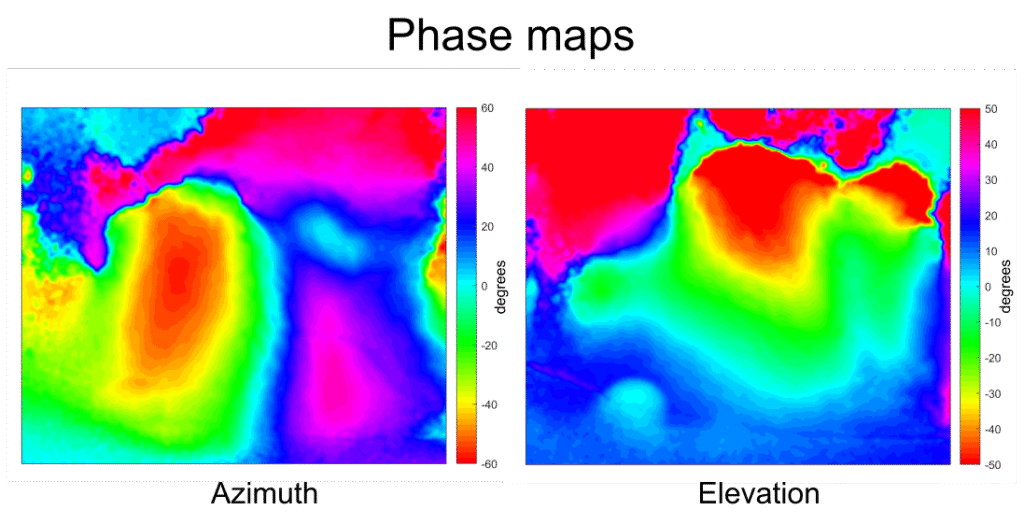 In the context of the visual system, Kalatsky and Stryker (2003) proposed a retinotopic mapping procedure using this approach. A bar drifts periodically across a screen in the animal’s visual field in four cardinal directions. By performing Fourier analysis of the cortical responses, the phase component (phase maps) of the signal at the bar’s temporal frequency for each direction is extracted. These phase maps are then combined to create retinotopic maps for the horizontal (azimuth) and vertical (elevation) axes, where each color corresponds to the position of the bar in the visual field.