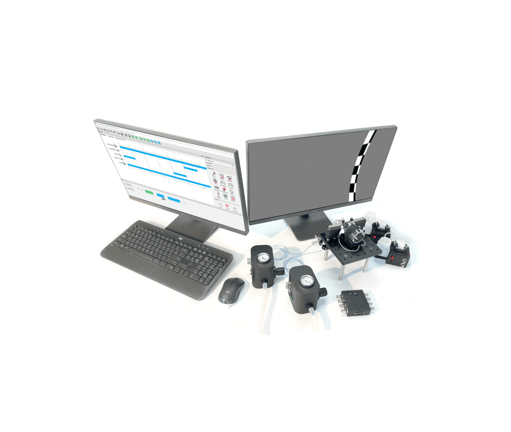 - Two 24″ control/stimulation monitors