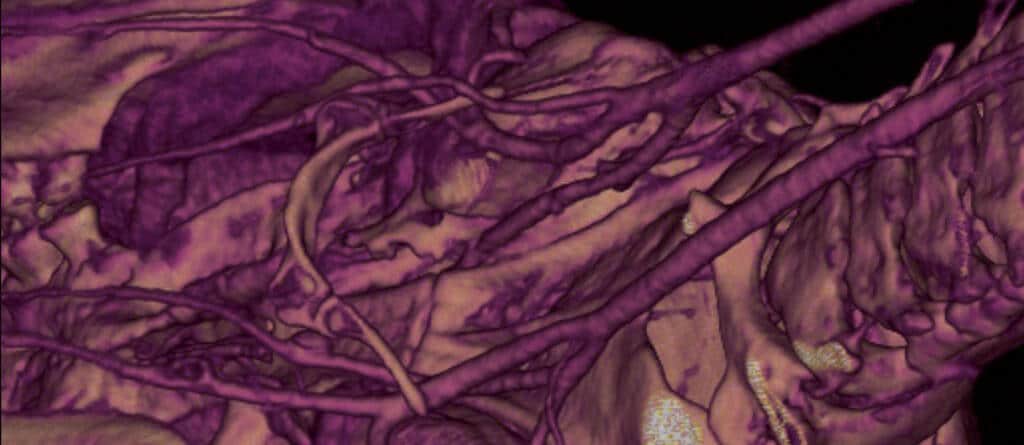 CT angio­graphy of mouse neck vasculature after injection of ExiTron U (left) and ExiTron V (right)