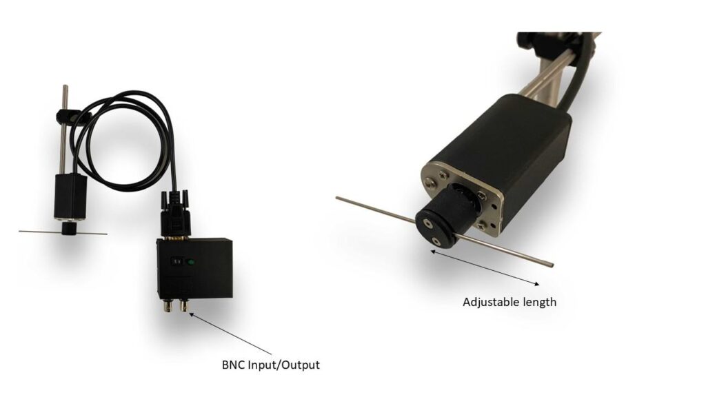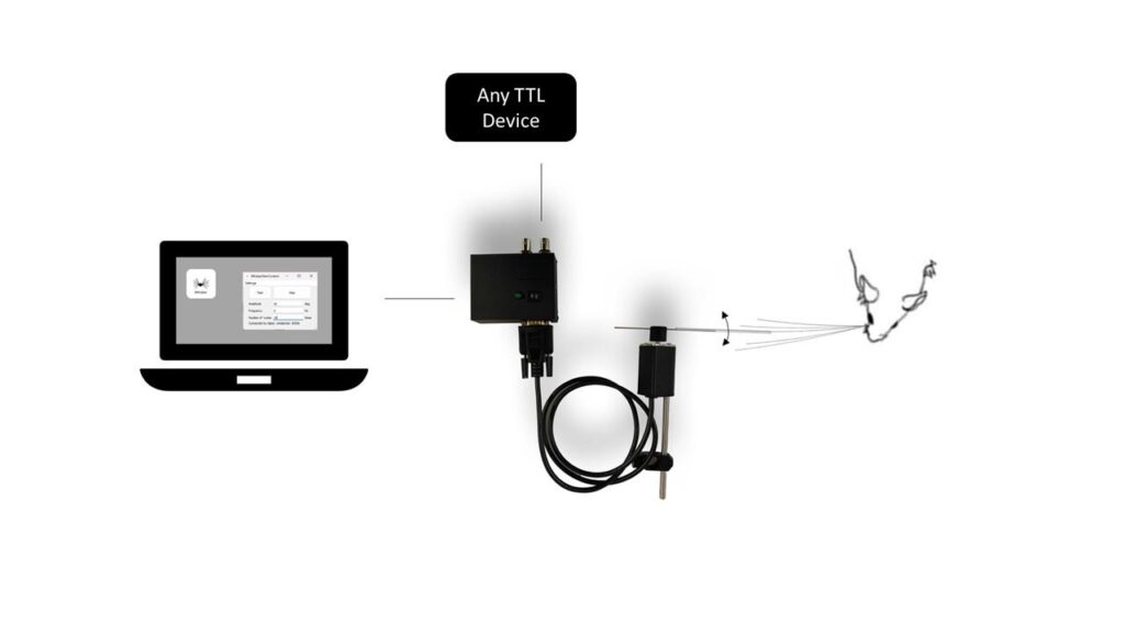 The device features an adjustable hollow tube that secures the whisker and allows modification in length to achieve optimal positioning. This adaptability accommodates a range of experimental configurations and whisker sizes, ensuring stable and reproducible stimulation across studies.