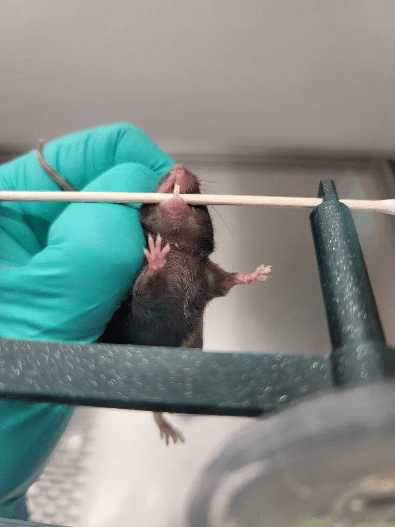 Allows user to control the trimming of the teeth of a mouse without injury. Suction cups allow the holder to be attached to the inside of the glass sash of a hood.