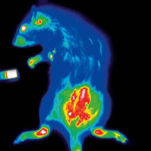 Bottom: Inflammation imaging in a rheumatoid arthritis rat model (right) versus the control animal (left) based on NiraWave M vascular leakage.