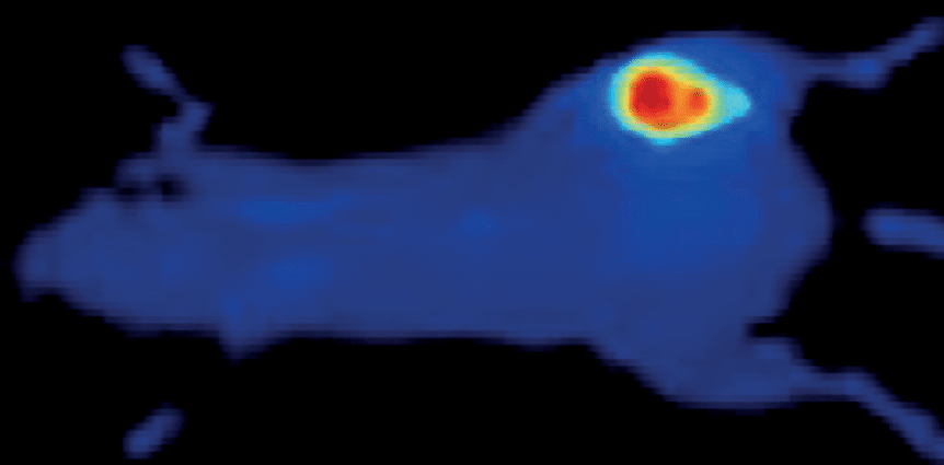 Bottom: Optical image of a mouse mopdel of human prostate cancer (PC-3) showing accumulation od NiraWave Rocker in primary tumor as well as in metastasized sciatic lymph nodes
