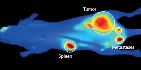 The near-infrared spectral range supports deep tissue penetration and reduced background autofluorescence, enabling high tumor-to-background contrast in small animal imaging.